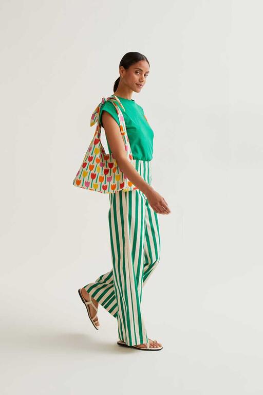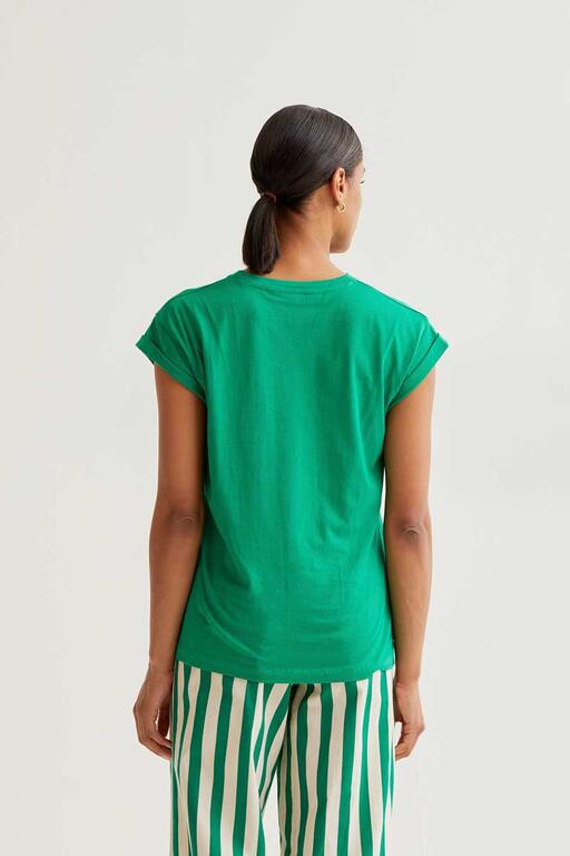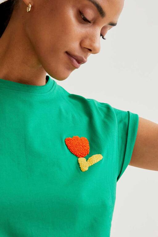 Camiseta verde con bordado de tulipán rojo